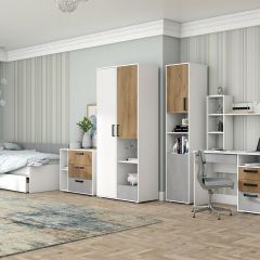 Модульная система "Юпитер" — серия молодежной мебели в современном стиле, одинаково подходящей как для девочек, так и мальчиков-подростков. В данной серии предусмотрены модули как для комфортного сна, так и для функционального хранения вещей и удобного рабочего места. Особого стиля придают современные контрастные ручки. Данная модульная система полностью соответствует потребностям растущего подростка. Они позволяют легко настраивать и перестраивать интерьер комнаты в соответствии с изменяющимися потребностями и предпочтениями вашего ребенка. Модули можно комбинировать и объединять, создавая уникальные и индивидуальные композиции, которые оптимально используют доступное пространство.