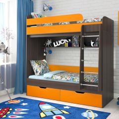 Двухъярусная кровать «Юниор-5» от производителя ЯРОФФ выполнена из качественных материалов, имеет надежное и прочное основание и крепления. На второй этаж ведет лесенка с металлическими перекладинами, для обеспечения дополнительной безопасности спальное место на втором ярусе огорожено бортиком. На первом под кроватью предусмотрены выдвижные ящики, в которых можно хранить постельное белье, игрушки или другие вещи.